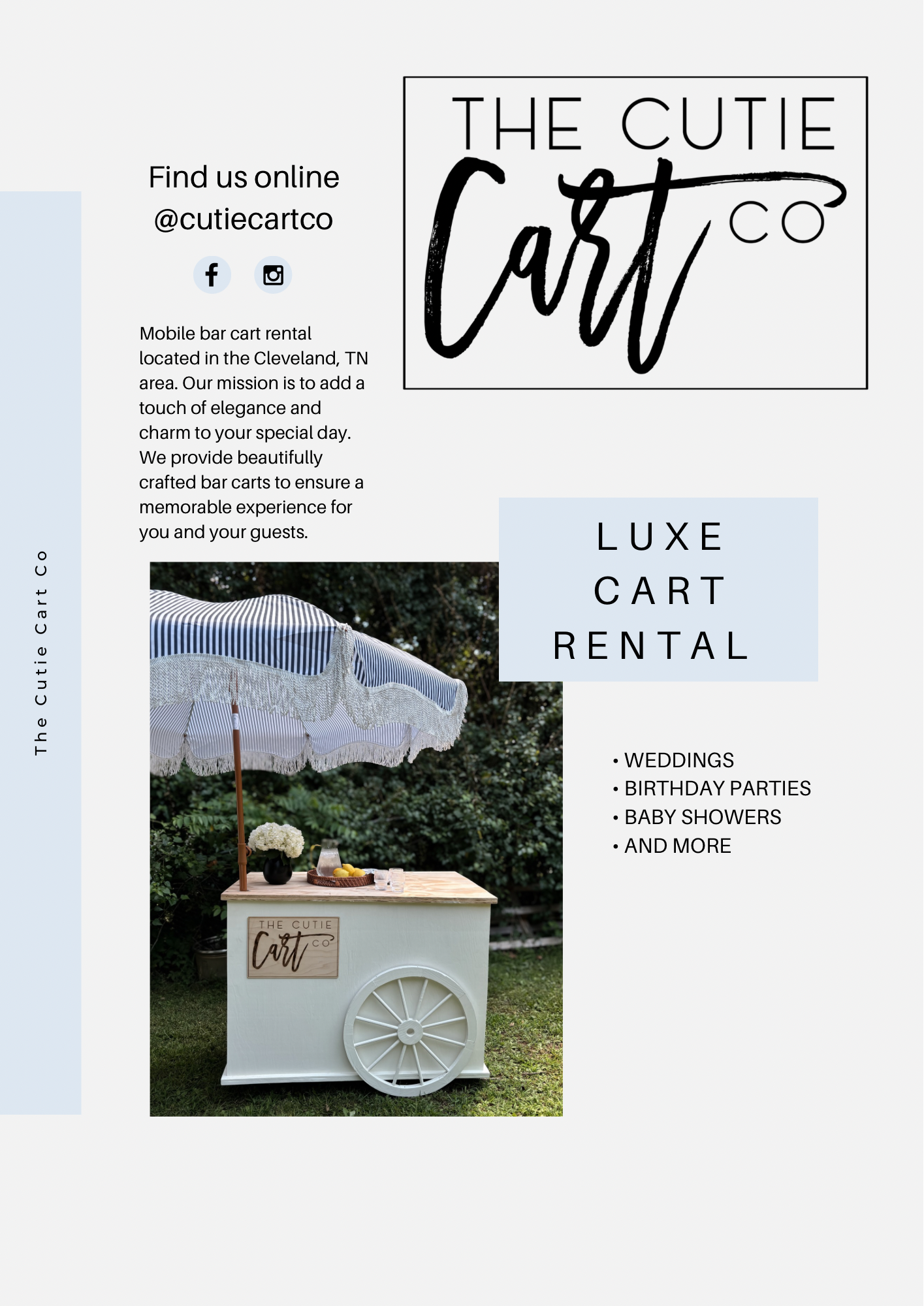 Based in Cleveland, Tennessee, our mobile bar cart rental service is designed to bring style and sophistication to your wedding or special event. We offer beautifully crafted bar carts that serve as both functional beverage stations and stunning décor pieces. Whether you’re planning a wedding, bridal shower, birthday, or corporate event, we’re here to help create a memorable guest experience with elegance and charm.